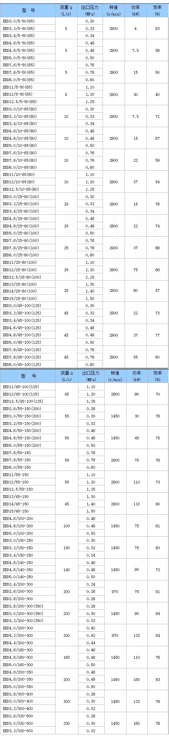 一、產(chǎn)品概述: XBD-W型臥式單級(jí)單吸消防泵組,供輸送不含固體顆粒的清水及物理化學(xué)性質(zhì)類似于水的液體之用,主要用于消防系統(tǒng)管道增壓送水,也可適用于工業(yè)和城市給排水,高層建筑增壓送水、遠(yuǎn)距離送水、采暖、浴室、鍋爐冷暖水循環(huán)、增壓空調(diào)制冷系統(tǒng)送水及設(shè)備配套等場合。 本司生產(chǎn)的XBD-W型消防泵組其性能、技術(shù)條件符合國家新頒布的GB6245-1998《消防泵性能要求和試驗(yàn)方法》標(biāo)準(zhǔn)的要求,產(chǎn)品經(jīng)國家消防裝備質(zhì)量監(jiān)督檢測中心測試合格,獲得上海市消防產(chǎn)品認(rèn)可證書。 二、產(chǎn)品特點(diǎn): 1、結(jié)構(gòu)緊湊、外形美觀,占地面積小。 2、運(yùn)行平穩(wěn),噪音低,組件同心度高。 3、采用 水力模型,效率高,性能出色。 4、軸封采用 機(jī)械密封,具有耐磨損,無泄漏,使用壽命長等特點(diǎn)。 5、泵進(jìn)口為水平方向,出口為垂直向上結(jié)構(gòu),便于管路布置。 6、維修方便,毋須拆卸管道,只要拆下泵蓋螺母,取出電機(jī)及傳動(dòng)組件即可進(jìn)行維修。 三、技術(shù)參數(shù): 流量:5 壓力:0.10-1.25Mpa; 功率:1.1-250KW; 轉(zhuǎn)速:980-2900r/min; 口徑:φ50-φ300; 溫度范圍:≤ 四、型號(hào)意義: XBD3.2/5-65W XBD – 消防泵組代號(hào) 3.2 – 設(shè)計(jì)壓力(1/10MPa) 5 – 設(shè)計(jì)流量(L/S) 65 – 進(jìn)出口直徑(mm) W – 結(jié)構(gòu)為臥式 160 – 葉輪名義直徑(mm) A – 葉輪經(jīng)第一次 五、XBD-W型臥式單級(jí)單吸消防泵性能參數(shù)表