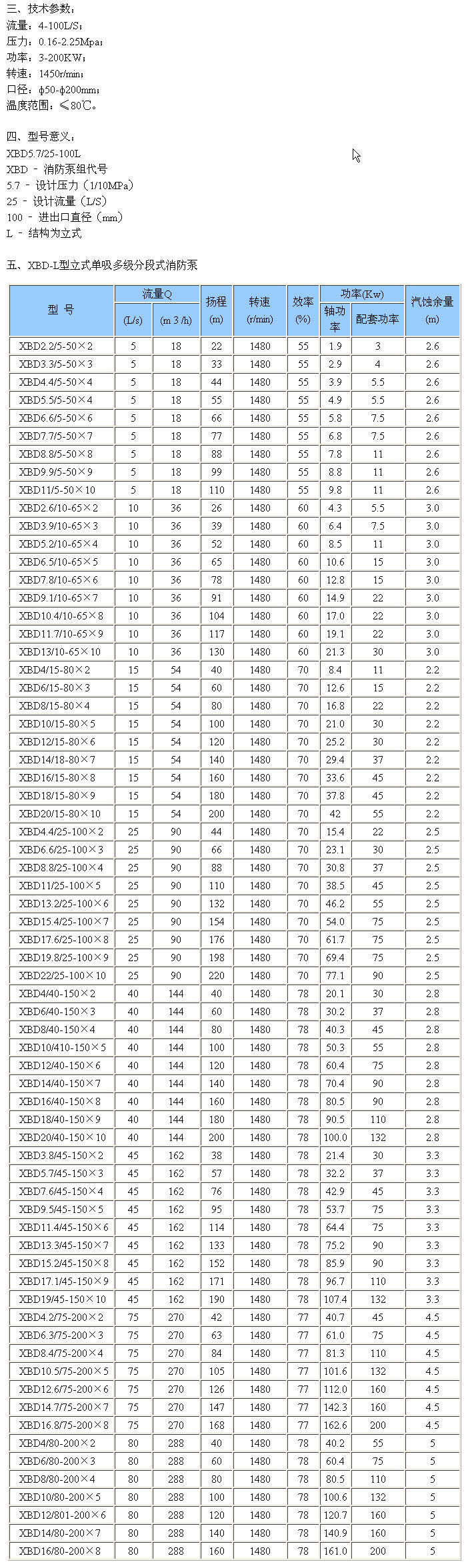 XBD-L型立式單吸多級分段式消防泵![]() XBD-L型立式單吸多級分段式消防泵 更多信息一、產品概述: XBD-L型立式單吸多級分段式消防泵組,供輸送不含固體顆粒的清水及物理化學性質類似于水的液體之用。主要用于消防系統(tǒng)管道增壓送水,也適用于工業(yè)和城市給排水,高層建筑增壓送水、運距離送水、采暖、浴室、鍋爐冷暖水循環(huán)增壓、空調制冷系統(tǒng)送水及設備配套等場合。 本公司生產的XBD-L型系列消防泵其性能、技術條件符合國家新頒布的GB6245-1998《消防泵性能要求和試驗方法》標準的要求,產品經國家消防裝備質量監(jiān)督檢測中心測試合格,獲得上海市消防產品認可證書。 二、產品特點: 1、泵機構緊湊、體積小、外形美觀,其立式機構決定安裝面積小,其重心重合于泵腳中心,因而增強了泵的運行穩(wěn)定性和使用壽命。 2、泵吸入口和吐出口均水平方向,簡化了管路的連接。 3、可根據(jù)需要,吸入口和吐出口可安裝成同方向或90°、180°、270°幾個不同方向以滿足不同的連接場合。 4、泵壓力可根據(jù)需要增減水泵級數(shù)并切割葉輪外徑予以滿足,而不改變安裝占地面積,這是其他泵類所不具有的。 5、泵轉子具有較小的繞度,運行平穩(wěn)、振動小、噪音低、使用壽命長。 |