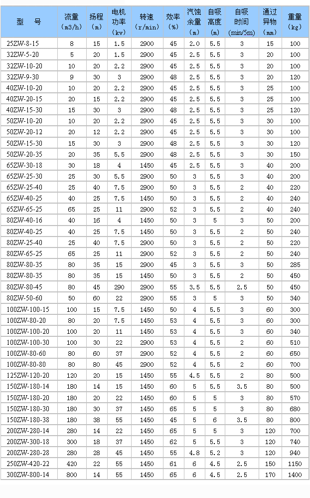 一、產(chǎn)品概述: ZW型自吸式無堵塞排污泵,是本司根據(jù)ZX型自吸離心泵及QW型潛水排污泵的結(jié)構(gòu)及性能,借鑒國外同類產(chǎn)品之優(yōu)點,研制而成的集自吸及排污于一身的 泵種。既可象一般清水自吸泵那樣不需安裝底閥,不需灌引水,又可抽吸含有大顆粒固體直徑為出口口徑的60%和纖維長度為葉輪直徑1.5倍的污物、沉淀物、廢礦雜質(zhì)、糞便處理及一切工程污水物和膠質(zhì)液體,完全減輕人力的勞動強度,而且安裝使用方便,極少維修,性能達到國際 水平,具有廣闊的應(yīng)用市場和發(fā)展前景 二、適用范圍: 適用于化工、石油、制藥、采礦、造紙、纖維、漿料、紡織、食品、電廠及市政排污工程、公共設(shè)施排污、河塘養(yǎng)殖等行業(yè)。 三、產(chǎn)品優(yōu)點: 1、排污能力強:特殊的葉輪防堵設(shè)計,確保了泵高效且無堵塞。 2、 :采用優(yōu)秀水力模型,效率比一般自吸泵高3~5%。 3、自吸性能好:自吸高度比一般自吸泵高 四、技術(shù)參數(shù): 流量:5 揚程:12 電機功率:2.2-55KW; 轉(zhuǎn)速:1450-2900r/min; 口徑:φ25-φ300; 介質(zhì)溫度:≤ 自吸高度:4.5 五、型號意義: 六、ZW型自吸式無堵塞排污泵性能參數(shù): |
