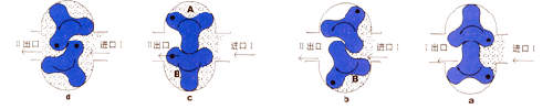 LQ系列膠體泵-又稱羅茨泵、不銹鋼轉子泵、凸輪泵、萬用輸送泵、酵母泵、蝴蝶泵、三葉泵、鞋底泵、藥料泵、熱溶膠體泵、顆粒膠體泵、渣料泵、蛋白渣泵、高濃漿泵等,依靠兩個同步反轉動的轉子在旋轉過程中于進口處產生吸力(真空度),從而吸入所要輸送的物料。兩轉子將轉子室分隔幾個小空間,并按a b c d 的次序運轉;運轉至位置a 時,只有 I 室中充滿介質;到位置 b 時,B室中封閉了部分介質;到位置c 時,A 室中也封閉了部分介質;到位置 d 時,A、B 室與 II 室相通,介質既被輸送至出料口。