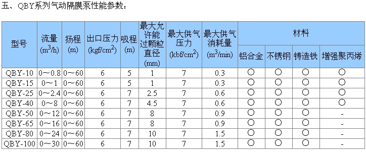 QBY型氣動隔膜泵一、產品概述: 本單位生產的QBY系列氣動隔膜泵是一種 輸送機械,采用壓縮空氣為動力源,對于各種腐蝕性液體,帶顆粒的液體,高粘度、易揮發、易燃、劇毒的液體,均能予以抽光吸盡。其性能參數與聯邦德國的WLLDENPVMPS、美國的MARlOWPUMPS相近。 二、主要用途: 1、泵吸花生醬、泡菜、土豆泥、小紅腸、果醬蘋果漿、巧克力等。 2、泵吸油漆、樹膠、顏料。 3、粘合劑和膠水、全部種類可用泵吸取。 4、各種瓦、瓷、磚器及陶器釉漿。 5、油井鉆好后,用泵吸沉積物及灌漿。 6、泵吸各種乳劑和填料。. 7、泵吸各種污水。 8、用泵為油輪,駁船清倉吸取倉內污水。 9、啤酒花及發酵粉稀漿、糖漿、糖密。 10、泵吸礦井、坑道、隧道、選礦、礦渣中的積水。泵吸水泥灌漿及灰漿。 11、各種橡膠漿。 12、各種磨料、腐蝕劑、石油及泥漿、清洗油垢及一般容器。 13、各種劇毒、易燃、易揮發液體。 14、各種強酸、強堿、強腐蝕液體。 15、各種高溫液體最高可耐 三、技術參數: 流量:0 口徑:10 自吸高度:5 四、型號意義: QBY-40 QBY - 氣動隔膜泵; 40 - 進出口直徑(mm) |