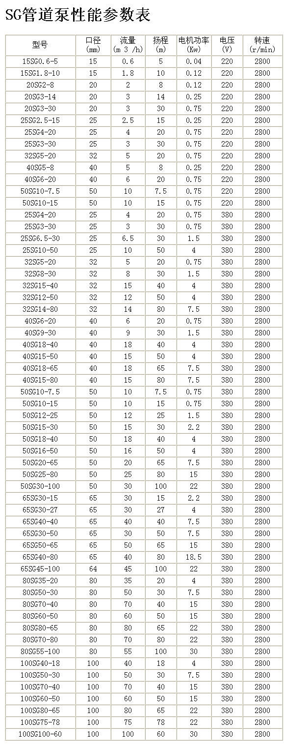 1.SG系列普通管道泵適用于高層建筑增壓送水、園林噴灌、冷卻塔上水、遠距離輸水、空調、制冷沖洗、浴室等冷;暖水循環加壓。使用溫度 2.SGR系列熱水管道泵適用于采暖、鍋爐等行業的高溫熱水增壓循環。使用溫度 3.SGP系列耐腐管道泵適用于輸送食品、制藥、造酒、化工等行業的工藝流程中腐蝕性介質,使用溫度 4.SGB系列防爆管道泵適用于輸送無腐蝕性液體,有甲烷或煤礦井下固定設備I類及工廠IIA、II B級,溫度組別為 T1、T2、T3、T4組存在爆炸性混合物的其它工業場所。使用溫度 5.SGPB系列耐腐防爆管道泵適用于輸送化工、制藥、石油、食品、國防等工業腐蝕性液體,有甲烷或煤礦井下固定設備I類及工廠IIA、IIB級,溫度組別為T1、T2、T3、T4組存在爆炸性混合物的其它工業場所。使用溫度 三、型號意義: