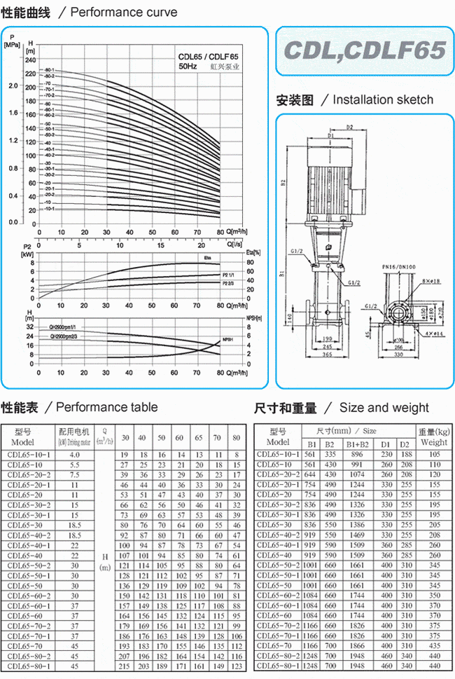 CDLF系列輕型不銹鋼立式多級泵性能參數表(2)