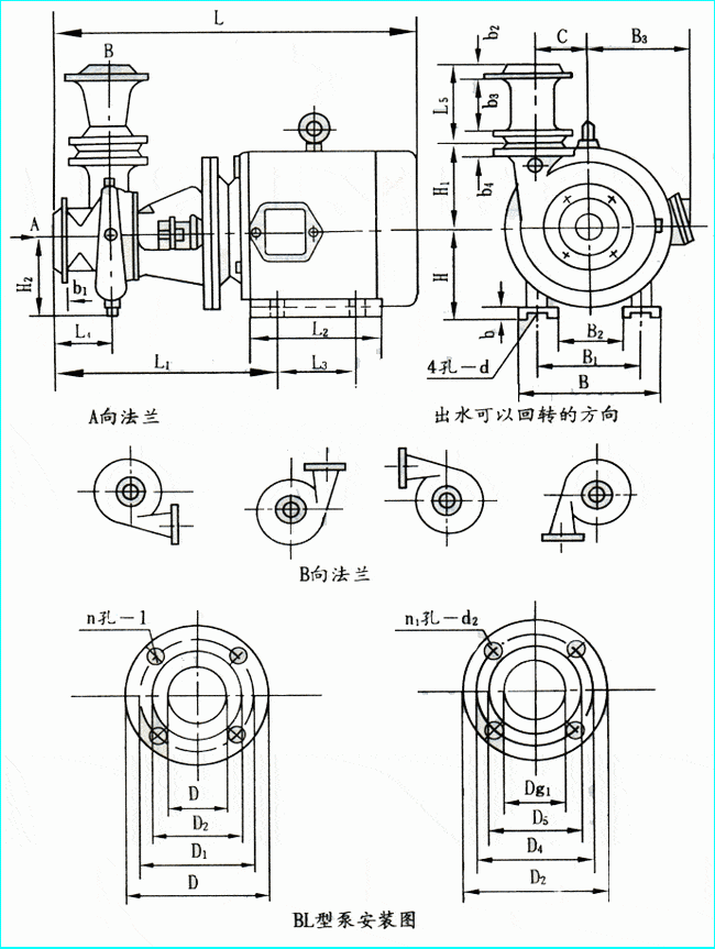 導航:回首頁---當前位置---水泵產(chǎn)品內容頁補充頁 >> BL型單級臥式離心泵外形安裝尺寸