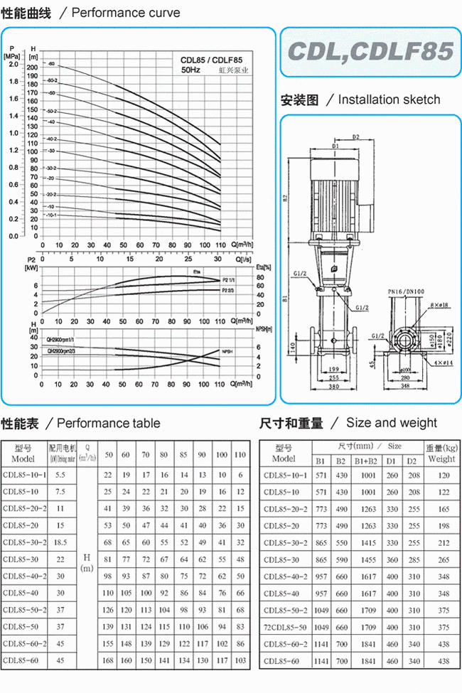 CDLF系列輕型不銹鋼立式多級泵性能參數表(2)