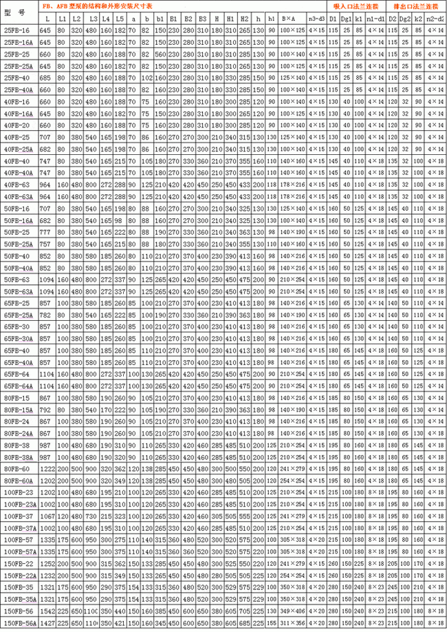 FB、AFB型耐腐蝕離心泵外形安裝尺寸表:
