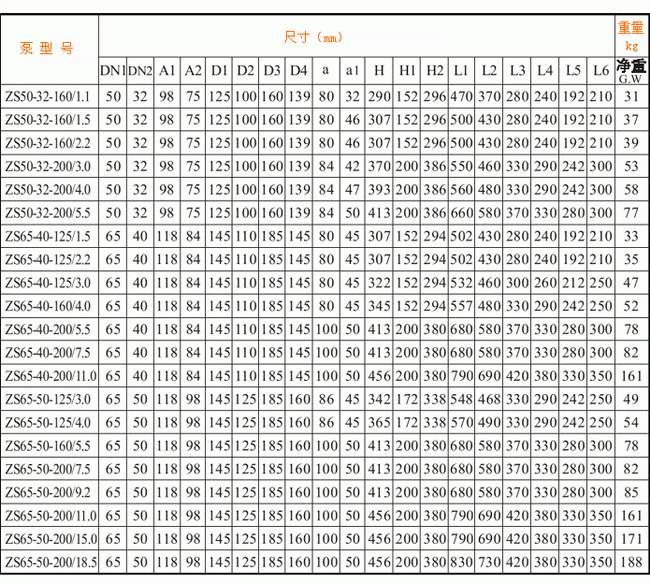 ZS型不銹鋼臥式單級離心泵尺寸表