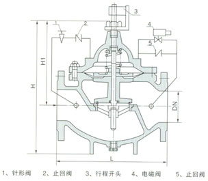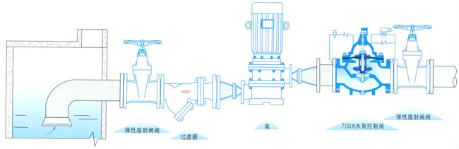 產品概述 700X水泵控制閥是一種安裝在高層建筑以及其他給水系統(tǒng)的水泵出口處,防止介質倒流的逆止閥門。當水泵即可將停止供水前,閥站先行緩慢關閉90%左右,防止突然停泵面產生的水錘或水擊反轉。該產品是水泵出口必不可少的保護裝置。閥門呈流線型設計,通過電磁閥的導控實現(xiàn)準確的啟閉,使用 ,有效地防止水錘和水擊聲,使用壽命長,安裝、維修方便。 典型安裝示意圖 典型安裝示意圖